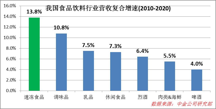 根据国家标准,速冻食品的温度标准是-18℃,从工厂到餐桌全程冷链运输,不需借助防腐剂,且能最大程度上保留食材风味,符合健康饮食和中餐消费的趋势。根据中金公司研究部数据,2010年-2020年我国速冻食品收入复合增长率为13.8%,超过其他食品饮料子行业。而据艾媒网数据,2019年美国人均速冻食品消费量为60千克,欧洲为35千克,日本为20千克,而我国仅9千克,仍有很大的发展潜力。