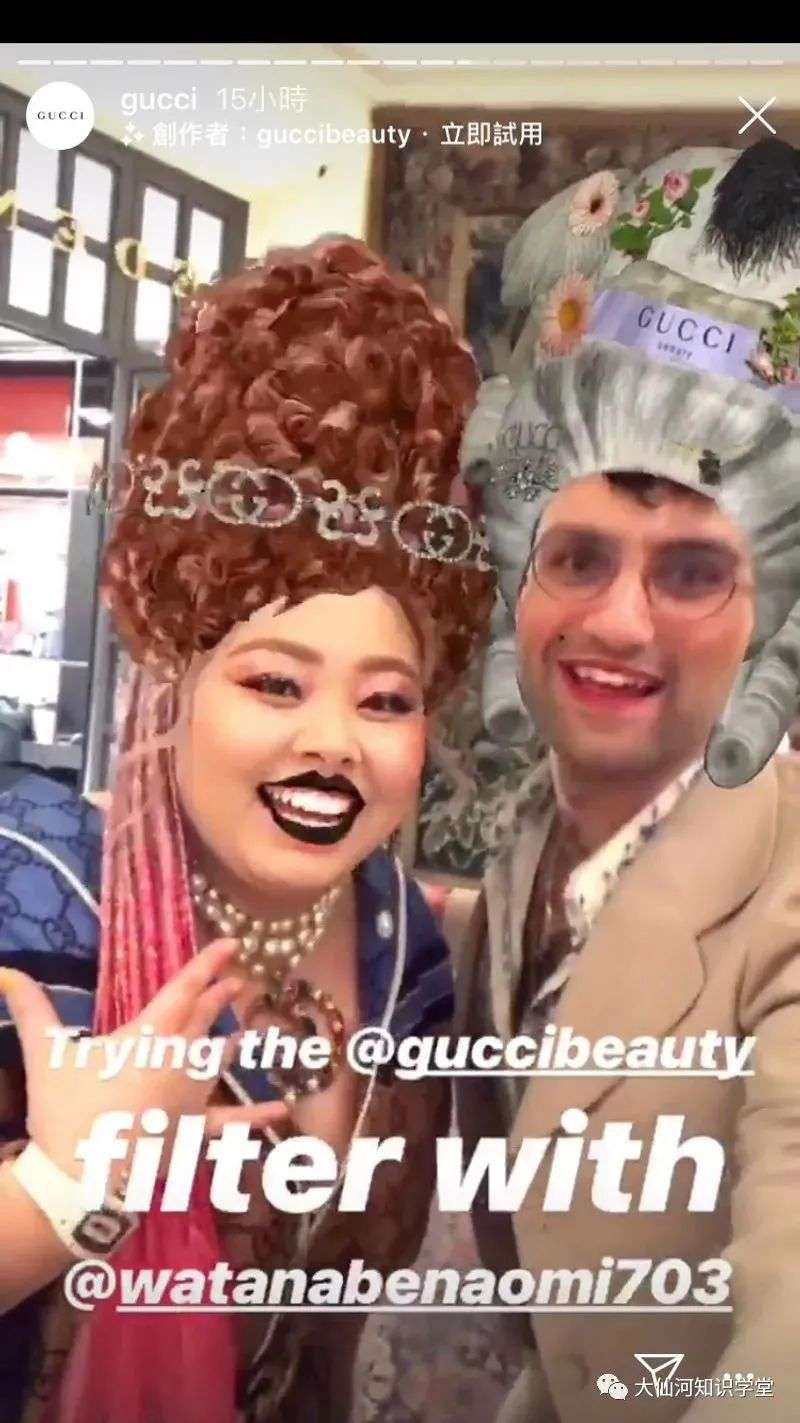 比如在ins上,Gucci、LV、Dior就订制了很多富含自己品牌元素的AR贴纸套装供用户使用,用户在拍照录视频玩的同时,也可以体验产品虚拟试穿、试戴的效果,进一步促进购买转化。