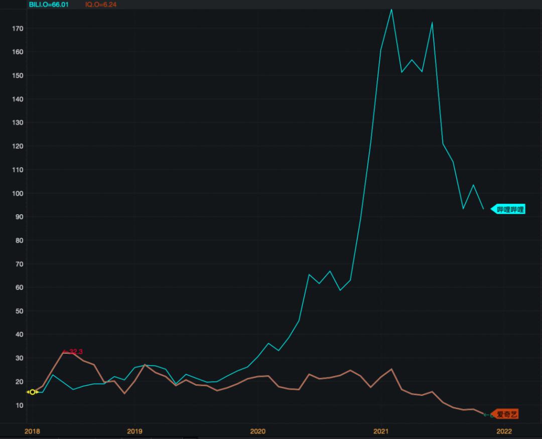 2018年以来,B站的股价已经和爱奇艺拉开差距