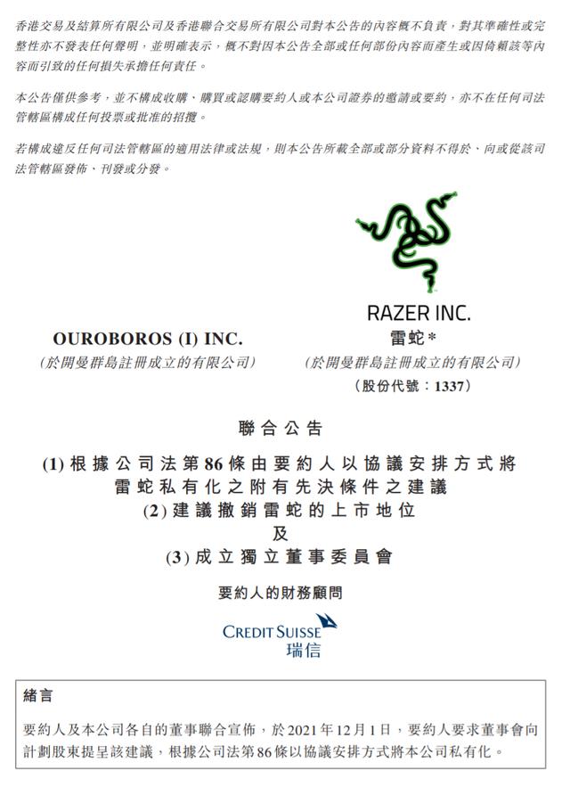 12月2日,雷蛇在港交所发布公告称,其主席、执行董事及行政总裁陈民亮、非执行董事Lim Kaling,及CVC等作为要约人,以协议安排方式建议将公司私有化,注销价为每股2.82港元,较该股昨日收市价2.67港元溢价约5.6%。