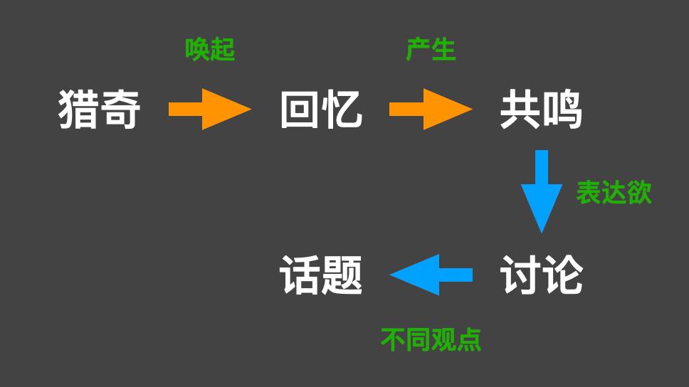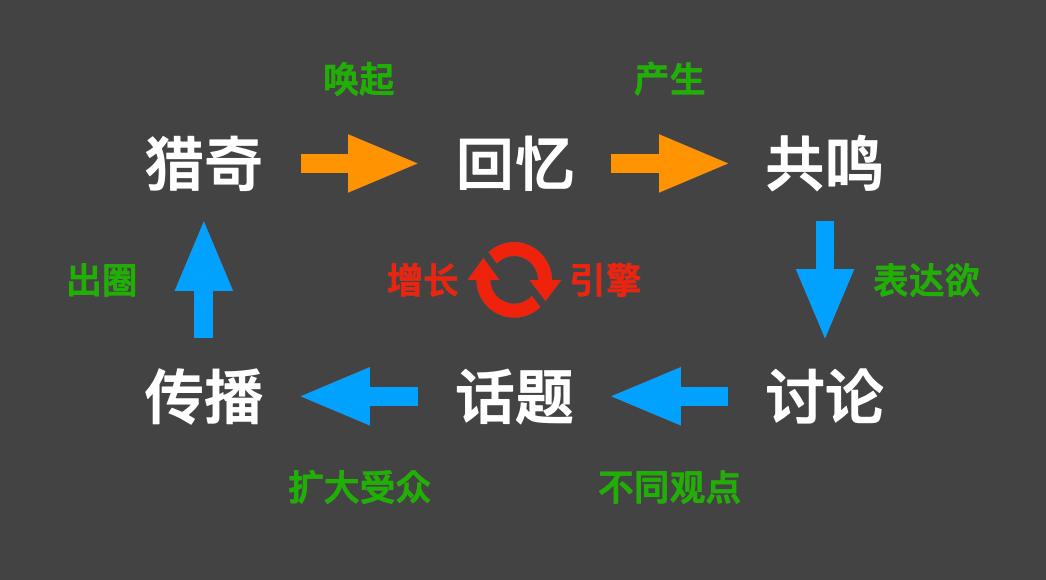 增长引擎会自发运转,只要不断有新的人进来猎奇,就会更多唤起回忆、产生共鸣、激发表达欲、形成讨论、形成不同观点、构建话题、扩大受众、开始传播、出圈。