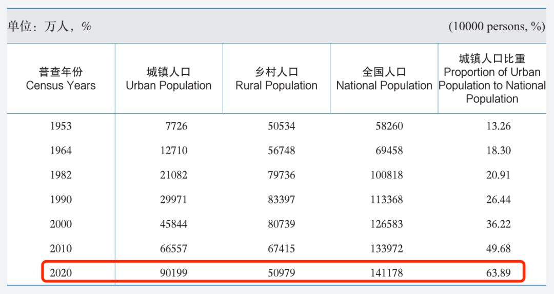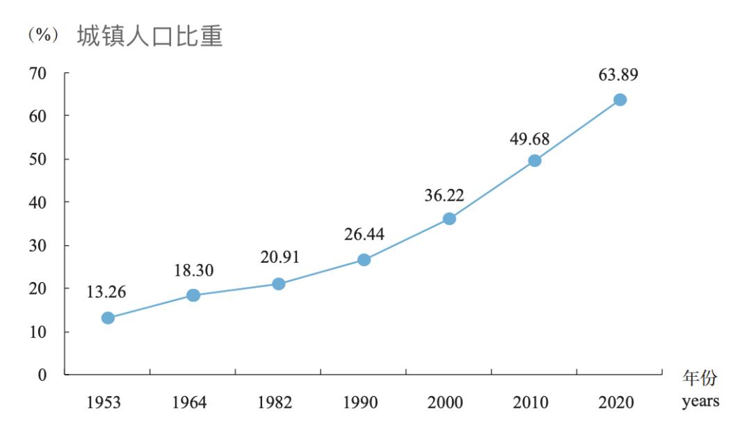 我从国家统计局找到了第七次人口普查的数据,其中有一项是我国城镇人口的占比,2020 年达到了 63.89%。