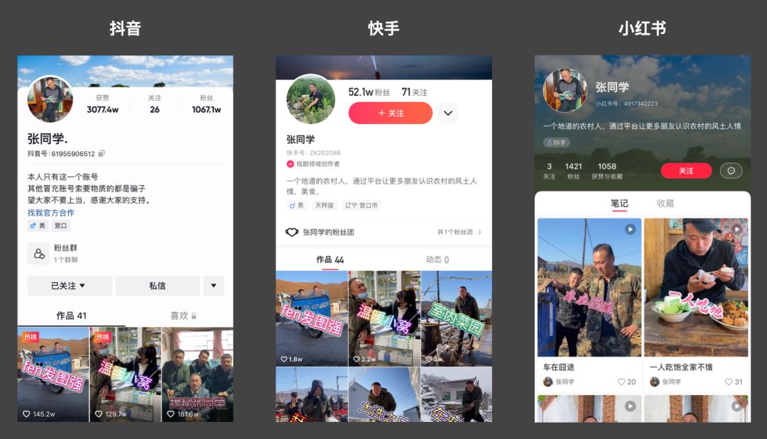 有趣的是,张同学在抖音上目前有 1100 多万粉丝,但在快手上却只有 50 多万粉丝,而小红书只有 1000 多个粉丝。