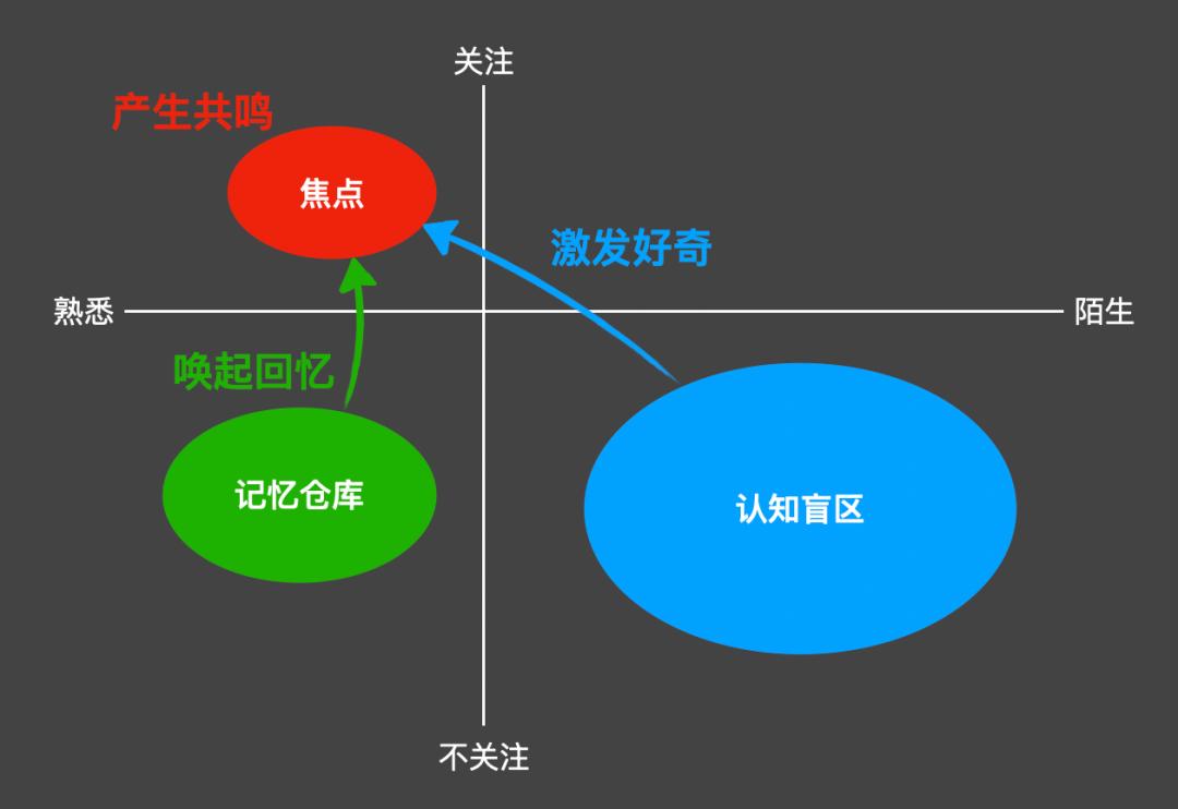 所以,通过唤起回忆的方式从记忆仓库往焦点区转移,通过激发好奇的方式从认知盲区往焦点区跨越,共同实现了共鸣效果。