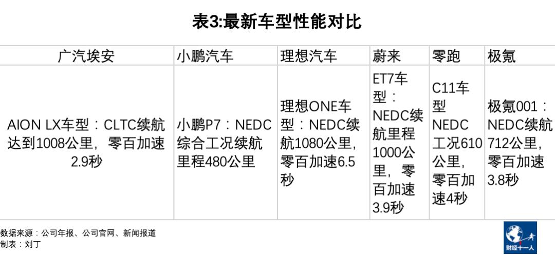 基于其电池技术,埃安推出的新车型性能领先对手,其AIONLX 车型CLTC续航可达到1008公里,百公里加速时间为2.9秒。
