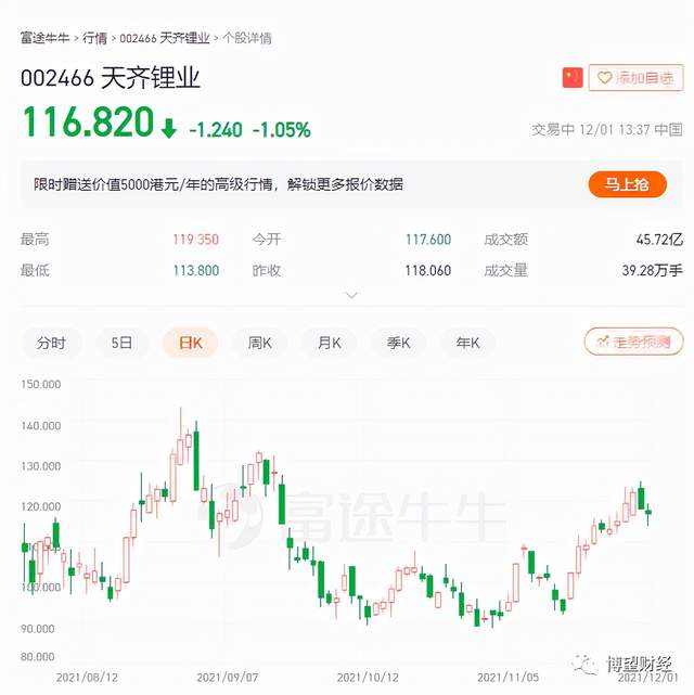 11月30日天齐锂业股价报收118.06元/股,较前一交易日收盘价下跌3.28%,进入12月仍持续回落。