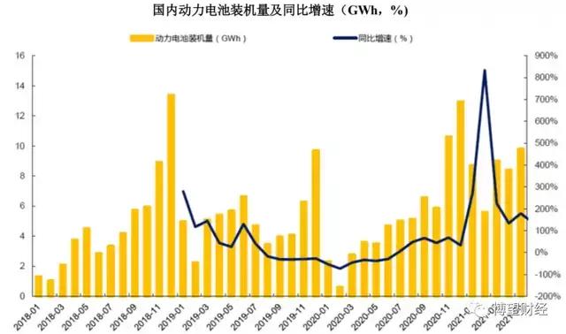 新能源汽车产销量的提升拉动了锂电池产业链的景气度,动力电池需求占比逐年扩大,成为锂消费市场主要的增长驱动力。动力电池的出货量与新能源汽车市场趋势高度相关,新能源汽车销量的上行将带动电池产量及电动化零部件新增量。随着全球汽车电动化趋势进一步强化,动力电池装机量实现平稳上涨态势。据SNE Research统计,2021年1-4月全球动力电池装机量累计达到65.9GWh,同比增长146%。据中国汽车动力电池产业创新联盟统计,2021年1-4月国内动力电池产量与装机量累计达到45.7GWh和31.6GWh,分别同比增长了251.84%和241.16%。