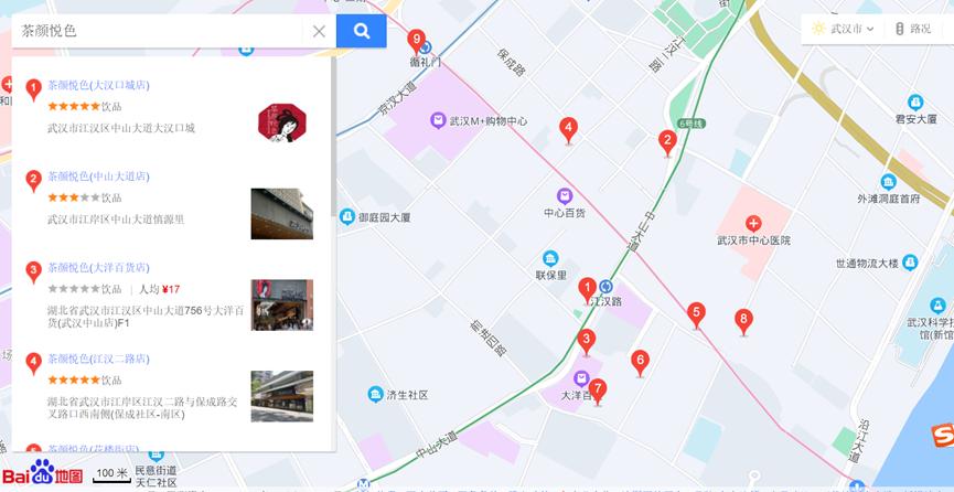 在确定了新战场后,茶颜悦色还把长沙的“打法”复制粘贴到了武汉。从选址上,看茶颜近80%的门店集中在汉口,且都分布在江汉路步行街与江宸天街的商圈范围内。
