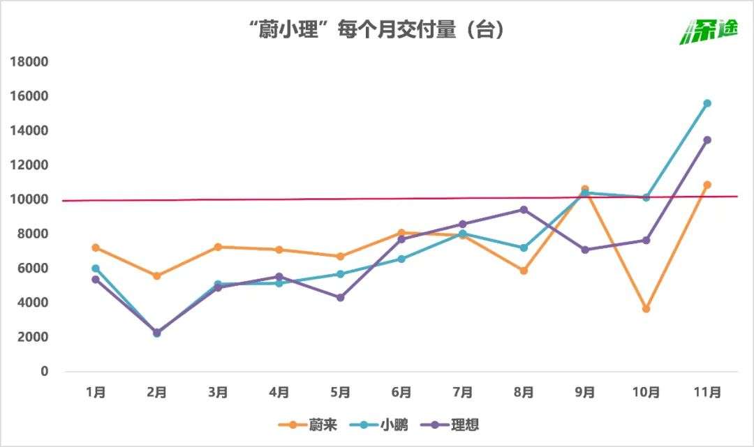 从此以后,每个月都有玩家能冲到一万台以上。在芯片短缺影响严重的10月,蔚来交付量暴跌至3667台,但小鹏还是过万了。11月,“蔚小理”全部过万,其中理想是首次。