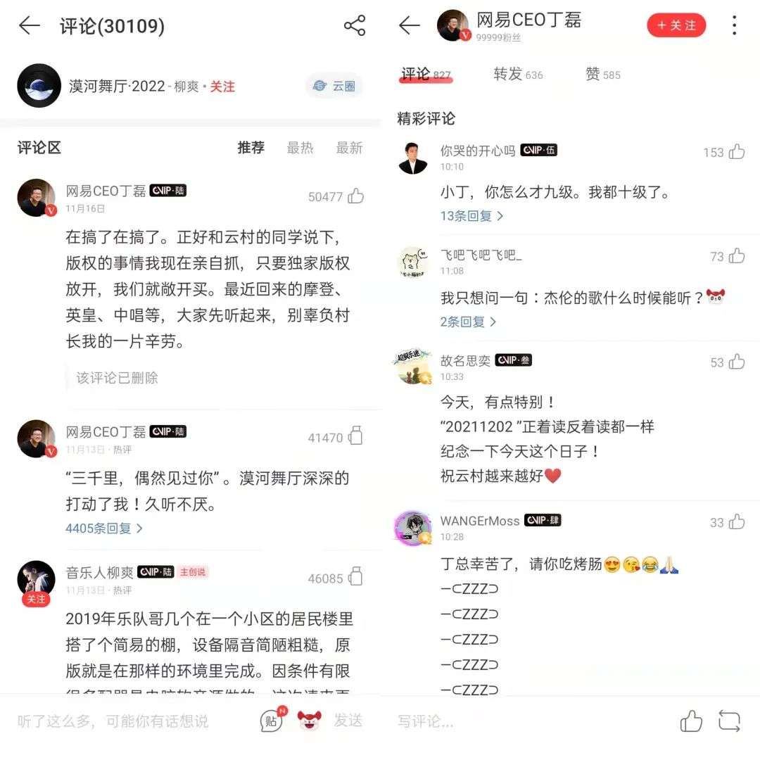 在丁磊的网易云音乐个人账号中,每一条动态下都挤满了“版权”二字,其中周杰伦歌曲版权的呼声尤其高。