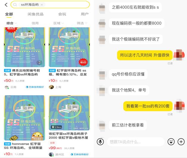 开服之前,“虹宇宙”的首批2万套虚拟房产已通过活动免费投放给了首批内测玩家,包括稀缺度在SS级别的“环海岛屿”200套。在意识到“商机”后,一场“虚拟资产”炒房热正在席卷着虚拟世界。在闲鱼上,此前“地契编号前5的SS级环海岛屿”一度挂出了50万的高价,现已下架。部分闲鱼卖家俨然化身为游戏新手指导客服,现标注S级的“极地木屋”房产标价为4400元,已有17人点“想要”,卖家一口拒绝了笔者砍价的要求。