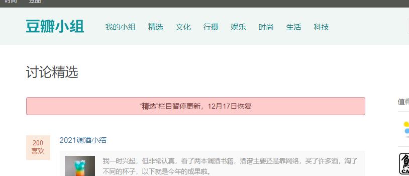 每经小编发现,豆瓣小组回复功能已暂停,小组“精选”频道也已停止更新。