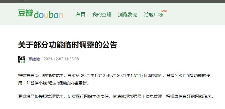 值得注意的是,12月2日午间,豆瓣社区氛围管理帐号“豆嬷嬷”公告称,根据有关部门的整改要求,豆瓣从2021年12月2日0时-2021年12月17日0时期间,暂停“小组”回复功能的使用,并暂停小组“精选”频道的内容更新。豆瓣将严格按照管理要求,切实履行网站主体责任,依法依规加强网上信息管理,积极维护良好的网络秩序。