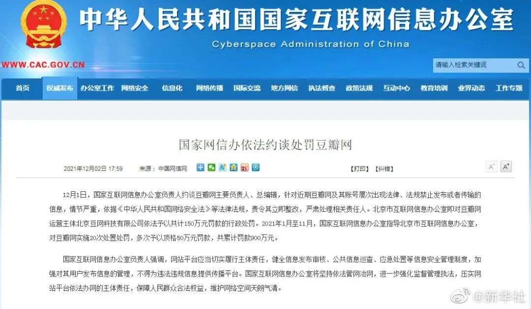 2021年1月至11月,国家互联网信息办公室指导北京市互联网信息办公室,对豆瓣网实施20次处置处罚,多次予以顶格50万元罚款,共累计罚款900万元。