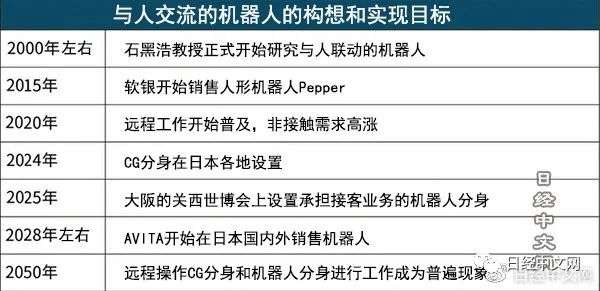 AVITA的目标是,到2024年前后,实现人类很自然地使用机器人分身来工作的社会。石黑教授预定为2025年的大阪关西世博会长期设置机器人分身,让机器人负责会场的接待工作。AVITA还计划2027年前后在日本国内外销售远程操作机器人。