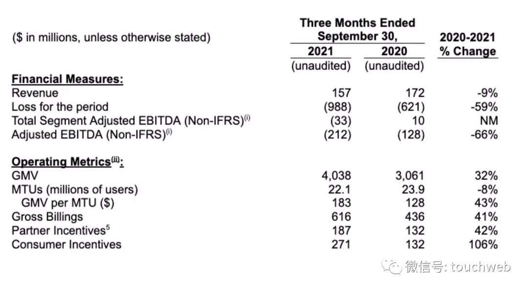 Grab在2021年第三季度净亏损高达9.88亿美元,较上年同期的净亏损6.21亿美元扩大59%;经调整EBITDA为-2.12亿美元,上年同期的经调整EBITDA为-1.28亿美元,同比扩大了66%。