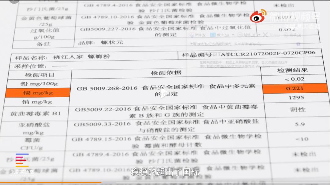 检验结果显示,柳江人家螺蛳粉镉含量每千克0.221毫克,超标了。螺蛳粉中米粉的原料是大米,大米的常见污染物是镉。《食品安全国家标准 食品中污染物限量》文件显示,我国对稻谷、糙米、大米及其三者制品的镉限量指标为每千克0.2毫克。