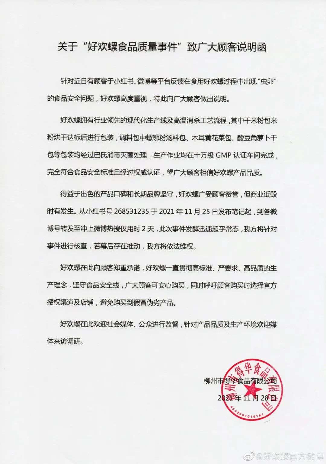 当晚,“好欢螺”微博官方再次回应:发布了《“好欢螺视频质量事件”调查进度说明》。文中,“好欢螺”表示:品牌已成立食品安全专项调查组;会积极配合调查。
