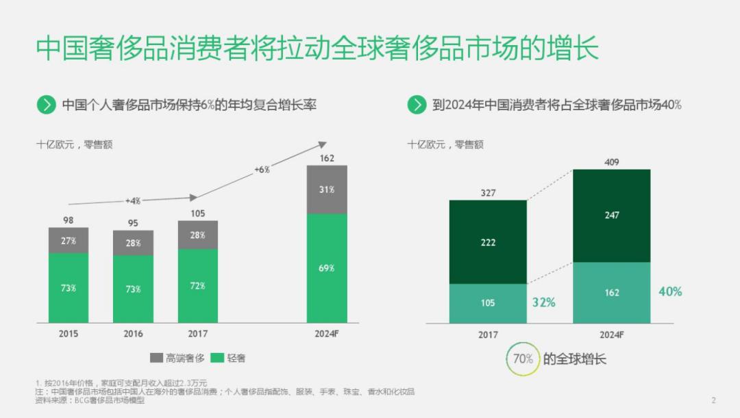 另一份来自波士顿咨询和腾讯联合发布的《中国奢侈品市场消费者数字行为报告》,同样佐证了中国奢侈品市场的广阔。报告显示:在全球奢侈品市场中,中国消费者比例已从2017年的32%增至2024年的40%,未来将带动全球奢侈品市场75%的增长。