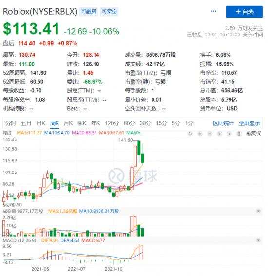“元宇宙第一股”Roblox的股价也水涨船高,截至12月2日美股盘后,Roblox每股报113.41美元,年内累涨152.02%,总市值已经达到了656.46亿美元。