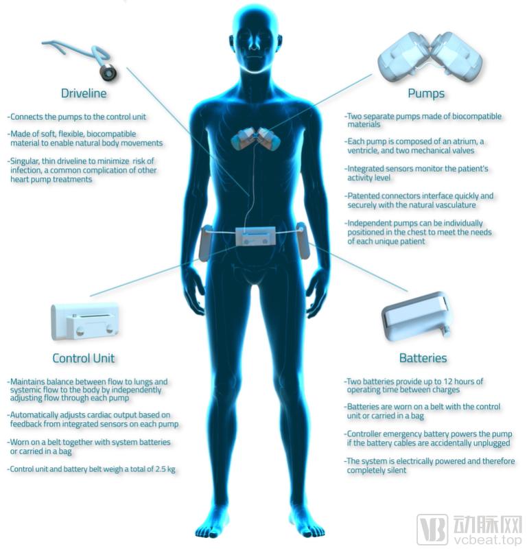 该产品由四部分组成——两个相同的心脏泵、智能控制单元、两个电池和一个传动系统组成。将被植入的部件采用生物相容性材料制成,以实现与身体的最佳相容性。