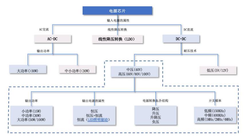 依据输入电源属性、工作原理、耐压高低、输出功率、输出电源属性、电源转换方式、开关频率等主要参数或技术指标,电源芯片可以分成以下几类(不包括驱动控制类、保护类、负载开关驱动类等非独立完成电源管理主要功能的辅助类电源芯片):