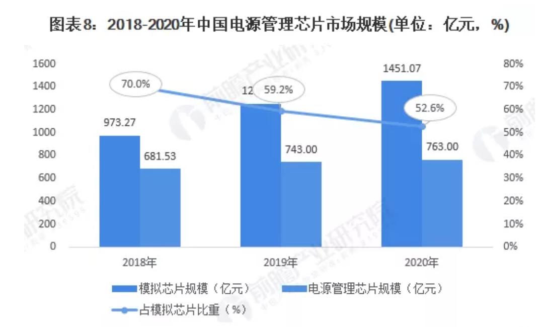当前,我国电源芯片市场规模稳步扩张,前瞻产业研究院数据显示,2020年模拟芯片业务市场规模约1451.07亿元,电源芯片作为模拟芯片的重要细分领域,初步统计2020年业务规模763亿元,占模拟芯片市场规模的50%以上。