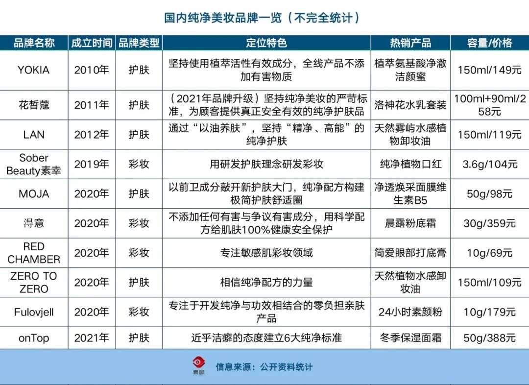 另在小红书上,有5400多篇与“纯净美妆”相关的笔记。纯净美妆风起,本土企业也趁势而起。青眼发现,2019年后,国内市场涌现了7个纯净美妆品牌,护肤与彩妆对半开。总体来看,青眼梳理的10个国内纯净美妆品牌,普遍价格定位大众,少数如onTop、淂意偏中高端,单品价格在179-400元之间。