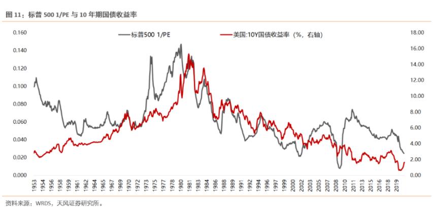 下图是美投十年期国债利率与“PE的倒数”的关系,两者基本同向,即利率与合理PE负相关。