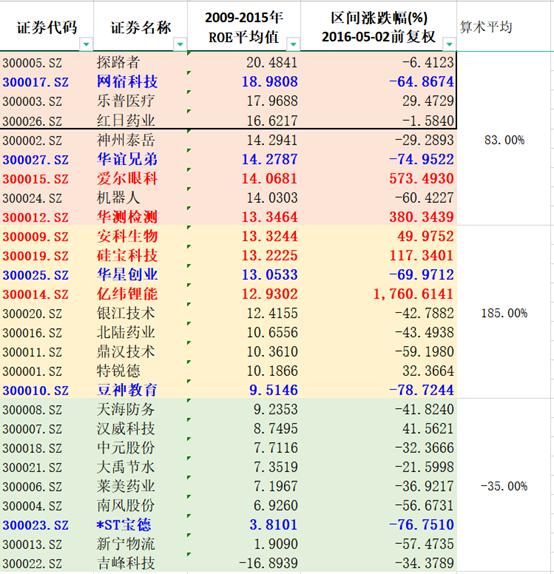 比如,这个表中还有一个有意思的现象,2009~2015年ROE在12~14%之间的公司,出现了严重的两极分化,四支创业板牛股全部出自这个区间,但最差的五家公司也有二支混在其间。