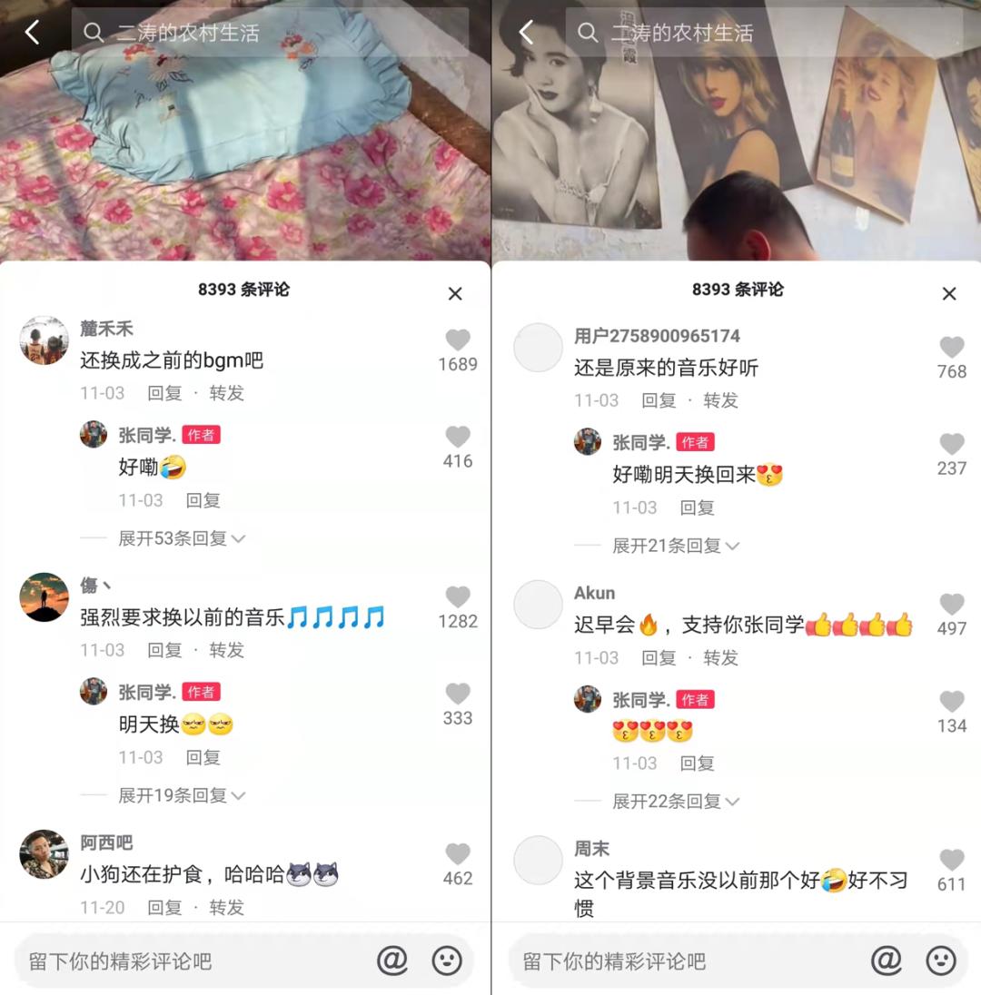 他的“精致”在于对镜头、人设、背景音乐等外在创作的专注。比如邻居二涛一开始并没有太多记忆点,后来每次都从厕所出现,逐渐衍生出“住在厕所的二涛”的梗。同样,现在的BGM也不是一开始就有,而是更新到第四条视频的时候才加上,且张同学中途曾尝试更换BGM,但市场反馈并不好,甚至评论区强烈要求换回去,才有了延续至今的“洗脑神曲”。