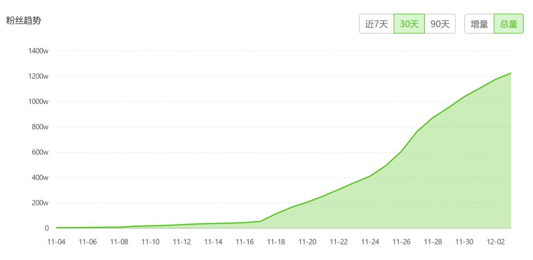 飞瓜数据显示,自11月17日起至今,张同学的粉丝量逐渐呈现出快速增长的态势。而在这个过程中,人民网也发表评论期待出现更多的“张同学”:“希望你们能用专业的技术,去记录真实的中国,让乡村生活走到观众面前来。”