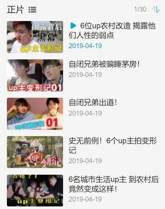 2019 年 4 月,B 站的六名 UP 主联合自制了一档偏向流水账的真人秀节目——《UP 主变形记》。这档节目参照了湖南卫视《变形计》的设定,六位 UP 主到某村庄体验不一样的生活,挑战每人 50 块生存五天,没有任何剧本,以团建日常为主,再加入随机制造的节目效果,有人假意失踪,也有人跑去村民家蹭吃蹭喝。