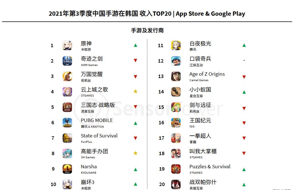 3、《2021年第3季度韩国移动游戏市场概览》,来源:Sensor Tower