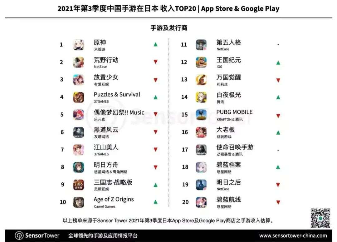 移动应用数据分析公司Sensor Tower数据显示,2021年上半年,日本最畅销的手游榜中有3款来自中国。其中,网易《荒野行动》位居第7位,米哈游《原神》位居第9位,有爱互娱《放置少女》排名第10位。