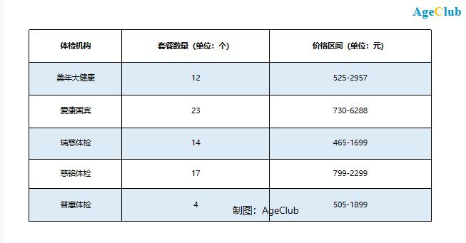 AgeClub盘点了各大机构乃至市场上的中老年体检套餐,价格基本集中在千元以上,千元以下项目较少且多是单项价格,显著高于年轻人体检套餐的价格。