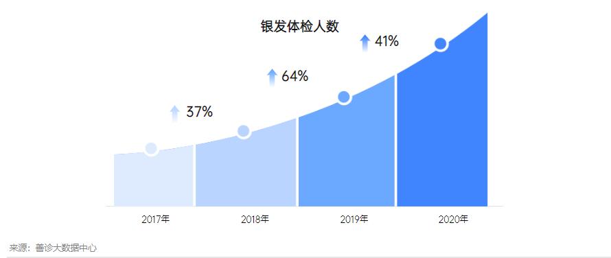 根据善诊的报告,近4年来,60岁以上银发群体的体检量逐年递增,增幅均超过35%,上升势头良好。可以看出,老年人对于健康体检的接受程度越来越高。