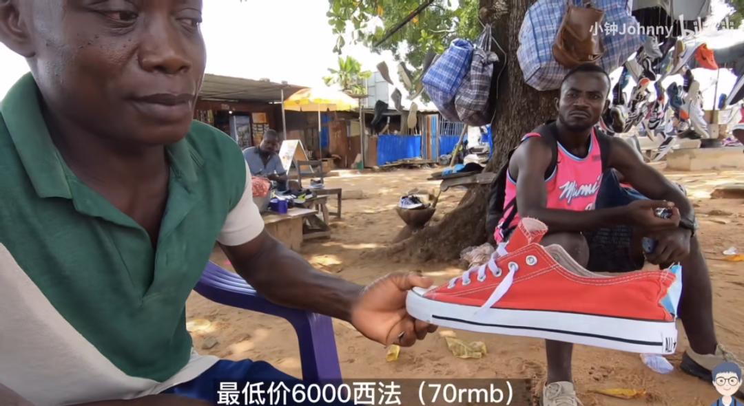 除了二手衣物,还有二手鞋售卖,它们经清洗后都相当干净。在小钟Johnny的视频里,黑人大叔向他展示自己的小摊:“一天能卖3~5双鞋,有的人能卖十几双”。球鞋售价不低,虽然是二手,但多为阿迪达斯、匡威、耐克等知名品牌,价格在60~100元左右。