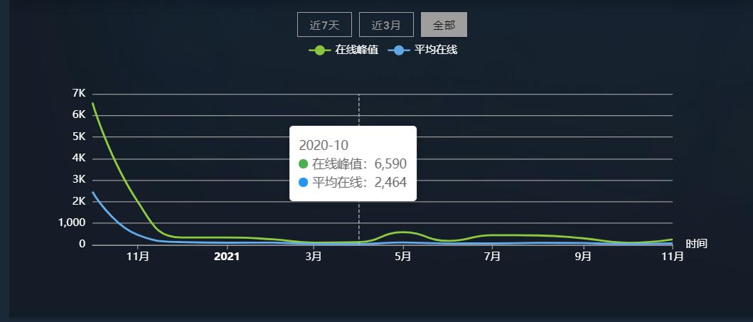 根据Steam官方数据统计显示,该产品在上架当月出现过6590的同时在线峰值,平均在线人数也高达2464。