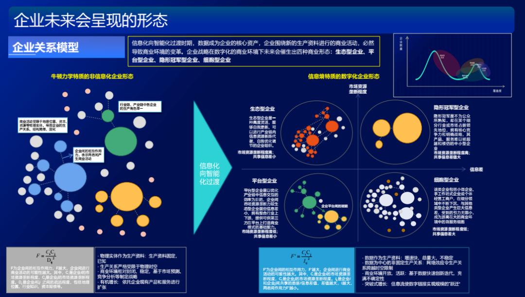 M型社会是日本学者大前研一提出的,当经济进入平稳甚至衰退期时,社会财富会像“M”的字型一样,分配在不同的阶层之中。根据《报告》的观点:信息化向智能化过渡时期,数据成为企业的核心资产,企业围绕新的生产资料进行商业活动,必然导致商业环境的变革。未来,在数字化商业环境下,企业间的传统联系将被信息联系所代替,企业将呈现4种新形态:生态型,平台型,隐形冠军,细胞型。