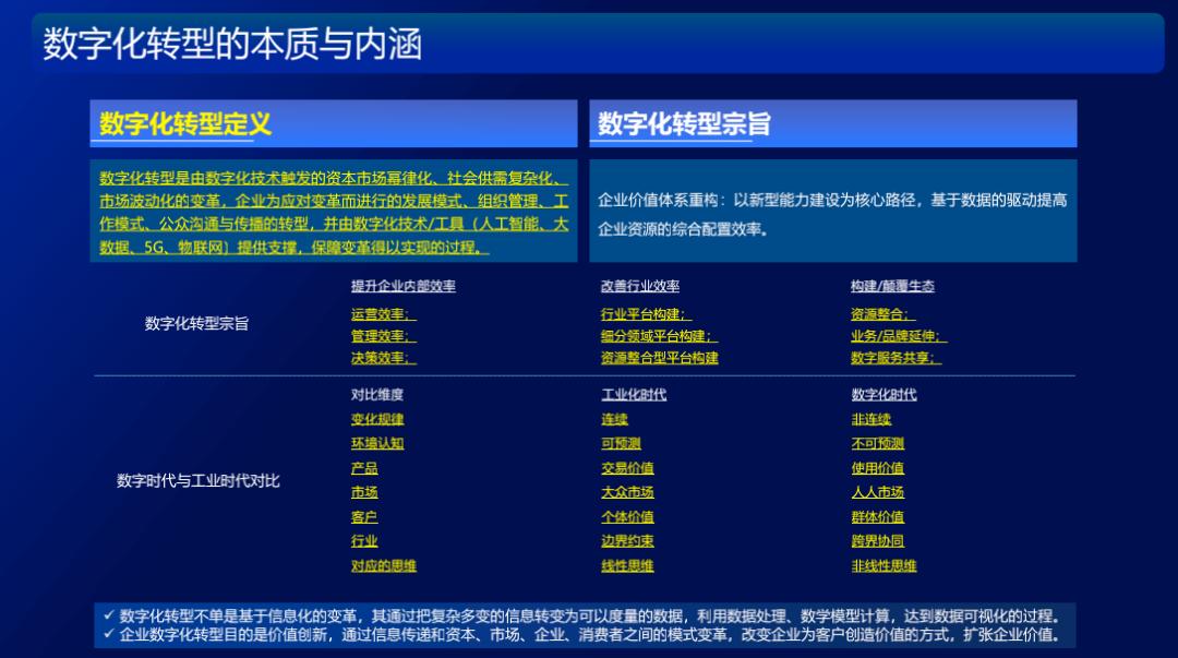 数字化不单单是传统企业的事情。数字化转型是由数字化技术触发的资本市场幂律化、社会供需复杂化、 市场波动化的变革,企业为应对变革而进行的发展模式、组织管理、工作模式、公众沟通与传播的转型,并由数字化技术/工具,如人工智能、大数据、5G、物联网等提供支撑,保障变革得以实现的过程。