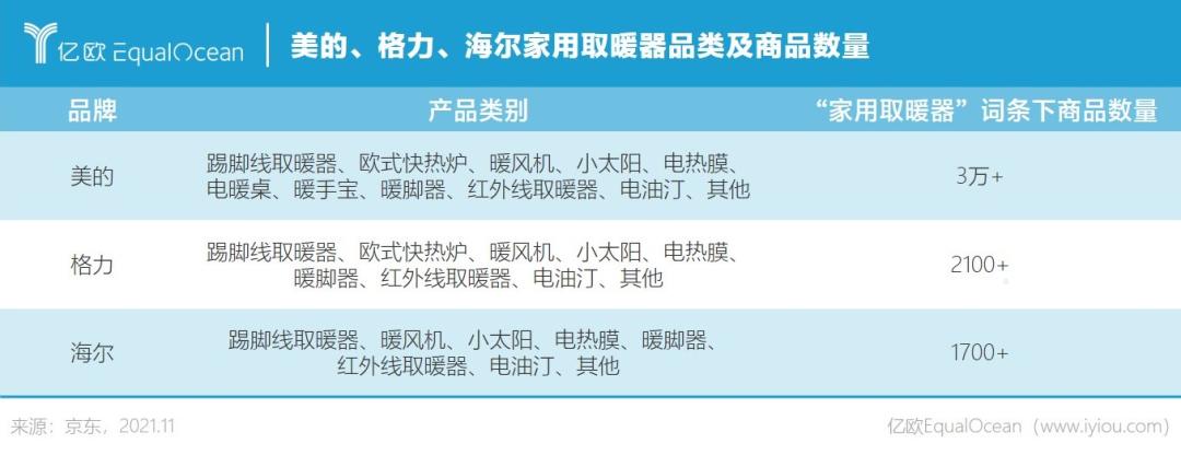其中美的品类最多,在京东平台搜索“美的家用取暖器”,显示的商品数量达3万以上,包括踢脚线取暖器、欧式快热炉、暖风机、小太阳、电热膜、电暖桌、暖手宝、暖脚器、红外线取暖器、电油汀等。