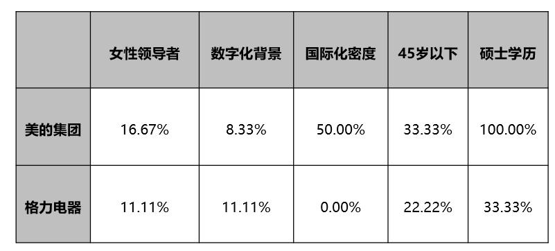 从两家公司年报批露的信息看,美的集团高管相对偏年轻化,平均年龄为50.3岁,而格力电器高管平均年龄则为54.3岁。在高管总人数中,女性高管、数字化背景、国际化密度、年轻化(45岁以下)、硕士以上学历等数量占比中,美的集团管理团队更具优势(表1)。