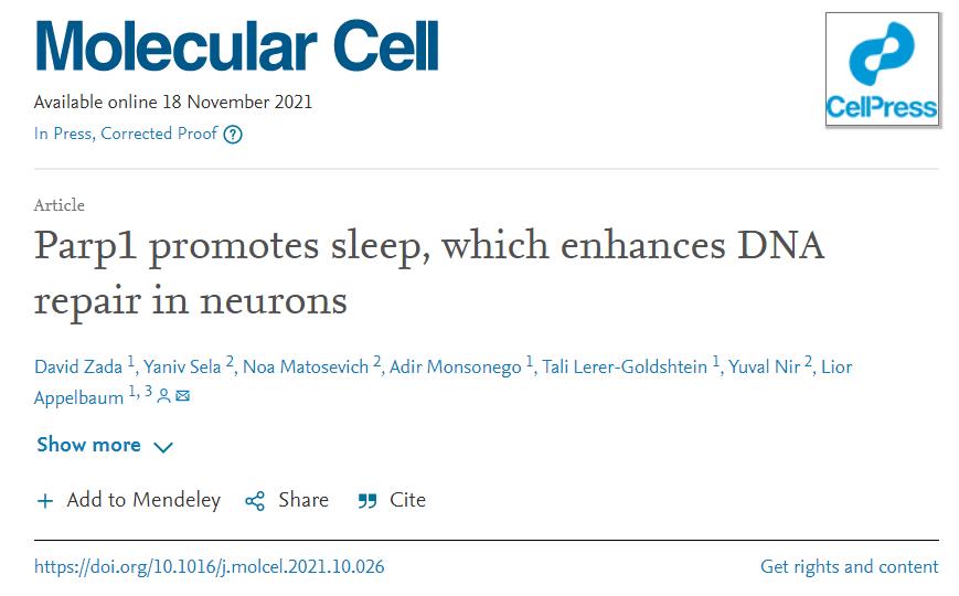 相关研究以“Parp1 promotes sleep, which enhances DNA repair in neurons”为题,发表在近期的 Molecular Cell 杂志上。