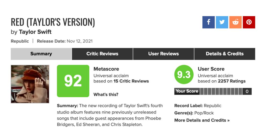 说回泰勒·斯威夫特,《Red (Taylor's Version)》里收录了一首10分钟版的《All Too Well》,这首歌的新版获得了乐评和听众广泛好评。