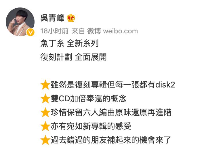 从吴青峰在记者会上只言片语中,我们听出的是,重录的专辑应该会是以“鱼丁糸”的名义发行,每张专辑都会是双CD包装,寓意“加倍奉还”。