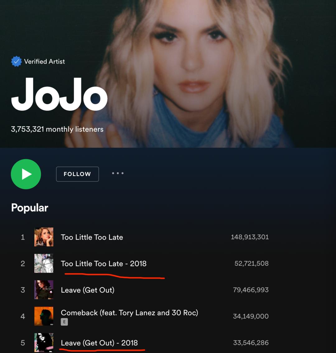 不过,名气远小于泰勒·斯威夫特的JoJo在2018年发行的重录专辑,在流媒体上也有不错的成绩。