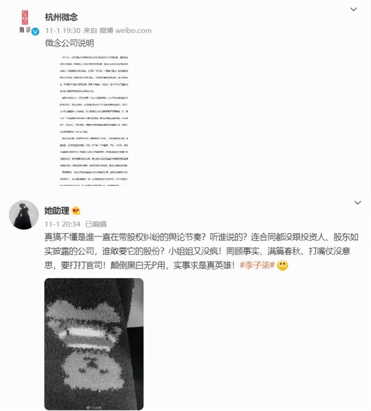 据微念官方微博声明称,曾与李佳佳就股权等权益事项展开沟通,但未有实质性进展,最终导致如今的局面,意欲将矛头指向李佳佳,说明其对于权益分配结果不满。