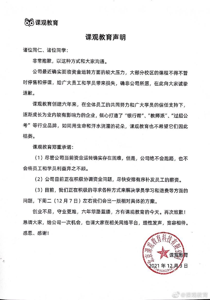 12月3日凌晨5点,课观教育官方发布声明,承认停课与资金链承压的事实,表示将在12月7日给出具体的解决方案。