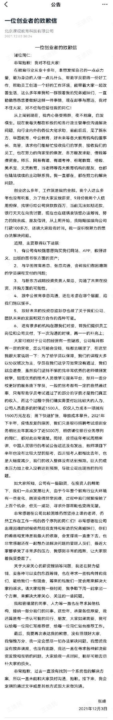 3小时后,张峰本人发布致歉信(铅笔道已向其确认真实性)。他表示,9月份他已经用个人信用担保找银行贷款数百万元,但目前无法如期还款。“现在在砸锅卖铁想办法筹钱。”张峰提到,近期对接了新东方、华图教育、中公教育、好未来等机构,请求他们接受客观的员工与学员。